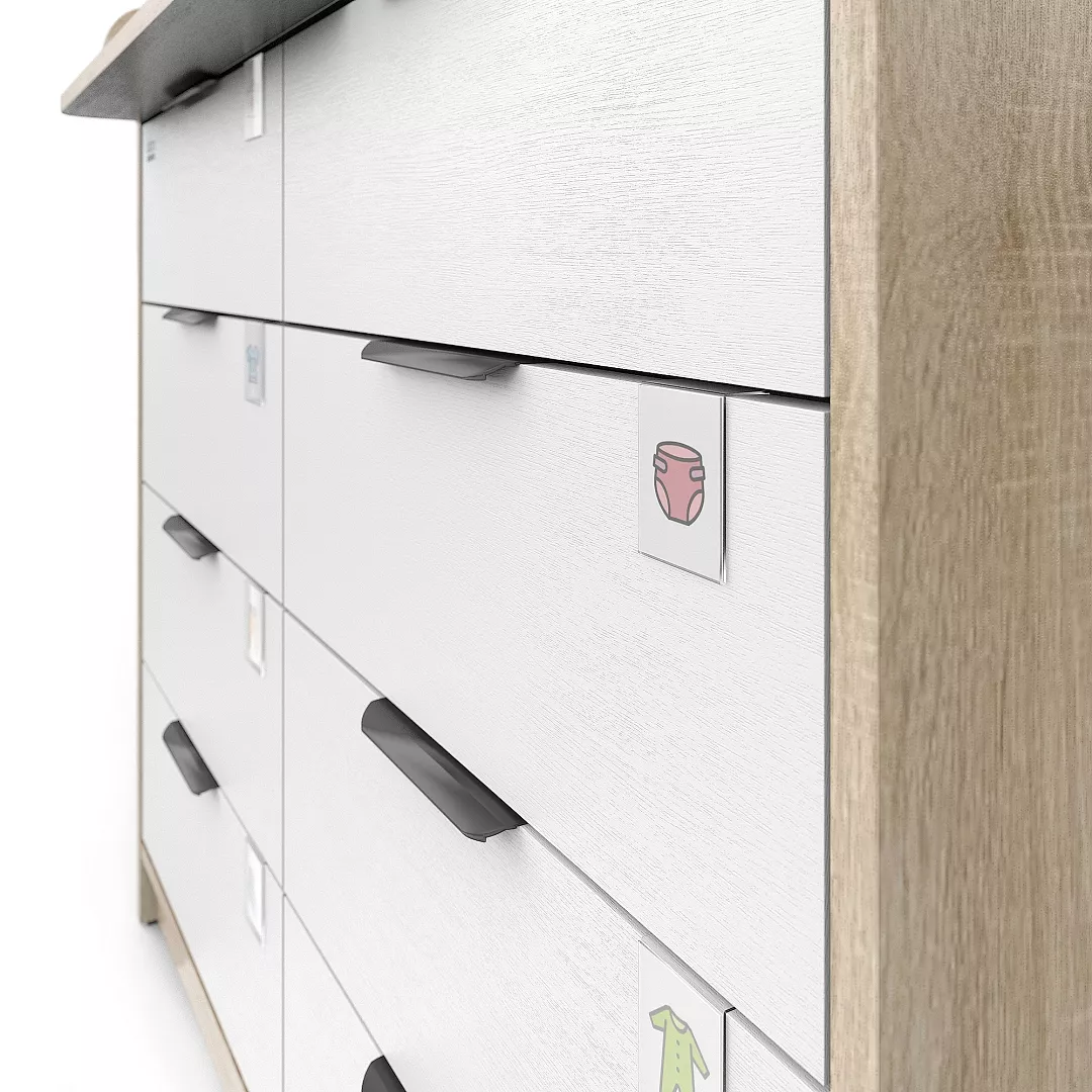 В комплекте с комодом идут специальные прозрачные пластиковые шильдики, которые, при желании, одеваются сверху на фасад. В них можно вставить любые картинки или рисунки. Базовый набор ярлычков-картинок принадлежностей для новорожденных в комплекте.