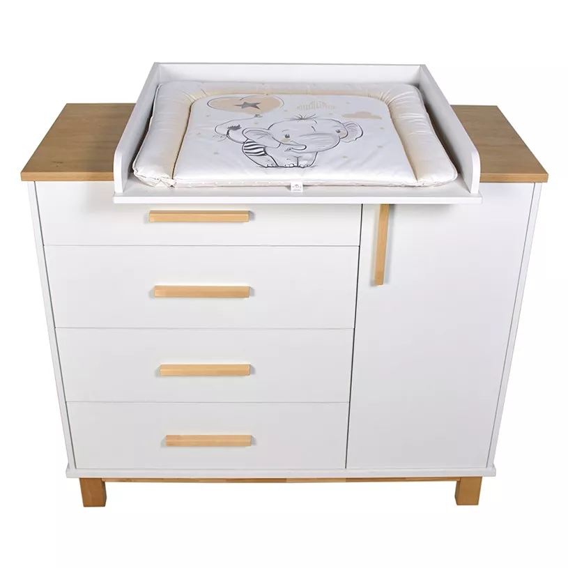 Пеленальная рамка не входит в комплект и продается отдельно. При этом после ее установки на топах комодов остается место, где можно разместить гигиенические принадлежности. Когда потребность в пеленании малыша отпадает, то рамка легко снимается, освобождая место для хранения вещей на топе комодов.