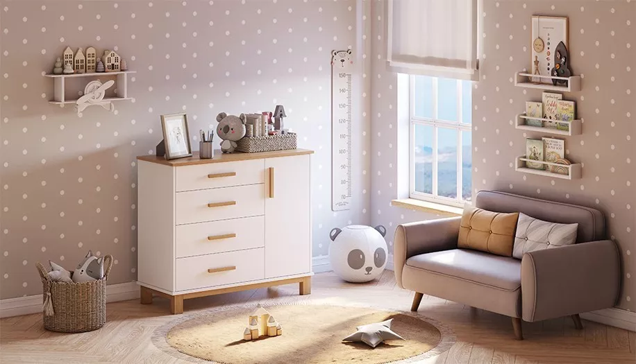 В вместительных ящиках на шариковых направляющих скрытого монтажа поместятся все те детские вещи, аксессуары и игрушки, которые должны быть всегда под рукой.