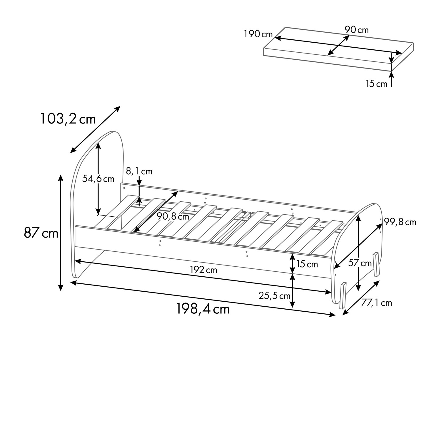 Кровать рассчитана на матрас размером 190x90 см. Это полноценный подростковый формат, который обеспечивает комфортный сон и хорошо подходит для ежедневного использования.